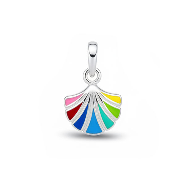 Wunderschöner Kinder Anhänger mit Muscheln aus 925 Silber. Der Muschelanhänger ist massiv verarbeitet und glänzend poliert. Die Oberfläche der Muschel ist in 7 bunten Farben lackiert.