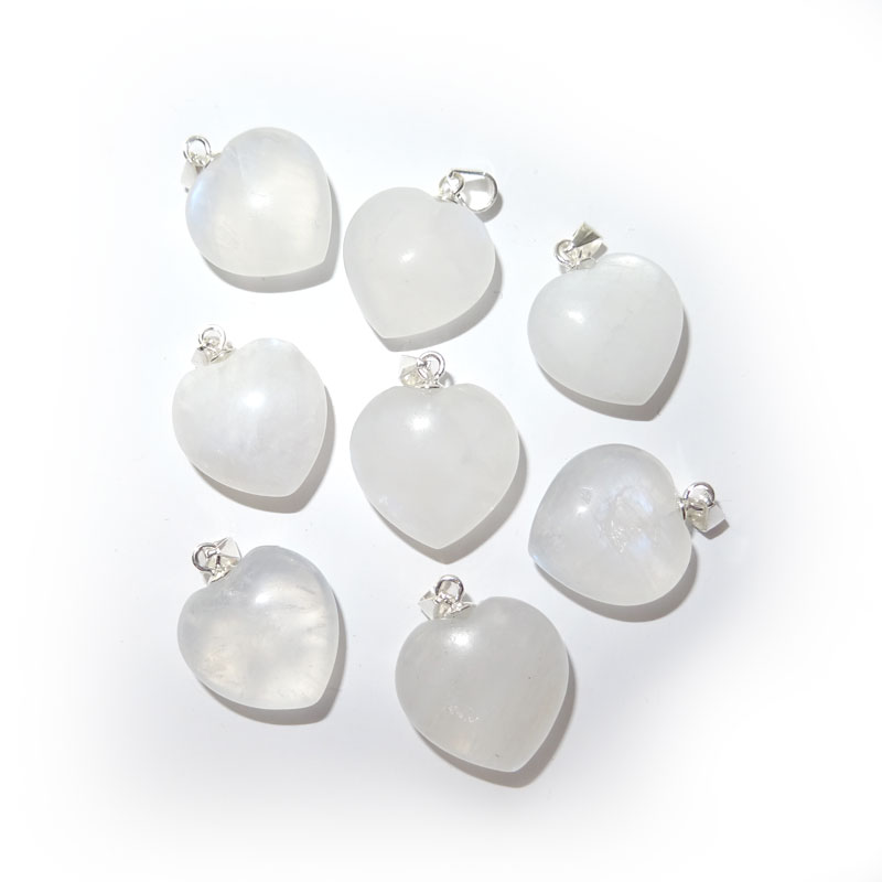 Schöner Mondstein Herz Anhänger mit Stift-Öse aus 925 Silber. Der Mondstein ist dreidimensional gearbeitet und kann damit beidseitig getragen werden. Er ist weißlich bis weißlich-durchsichtig und schimmert leicht bis mittelmäßig in blau oder regenbogenfarbend. Das 2. Artikelbild ist beispielhaft für unsere Auswahl. Der Preis bezieht sich auf 1 Anhänger.