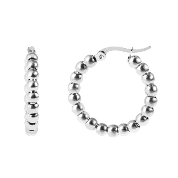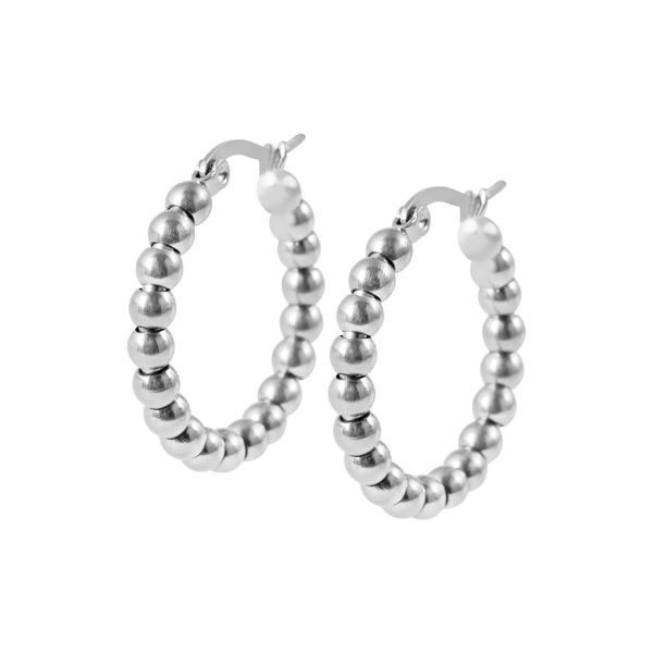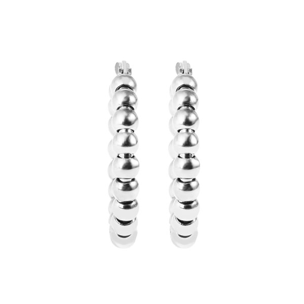 Glänzende Edelstahl Creolen mit vielen 4 mm großen Kugeln in der Farbe silber. Die Damen Ohrringe haben ein modernes Design und zeichnen sich durch ihre stabile Qualität aus. Sie sind recht schwer, da sie massiv verarbeitet sind. Eine Creole wiegt etwa 4,1 g. Die Kugeln sind beweglich an die Creolen angebracht.