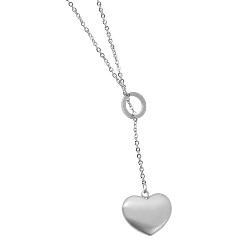 Zauberhaftes Herz Collier aus silberfarbenem Edelstahl. Das Herz ist an einer glänzenden Ankerkette angebracht, welche sich durch einen Ring fädelt. Es ist plastisch gearbeitet (3,8 mm stark) und sehr massiv. Sowohl das Herz als auch der Ring sind fein mattiert. Die Ankerkette ist mit 0,9 mm etwas zarter, aber sie lässt so den Anhängern den Vortritt. Sie ist 43 cm lang und hat ein 5 cm langes Verlängerungskettchen.