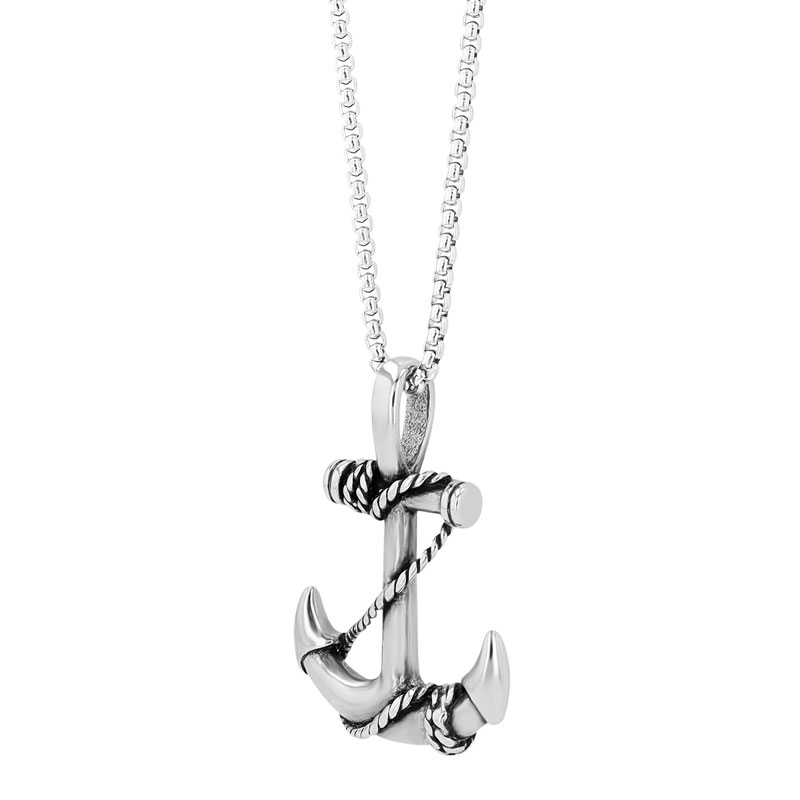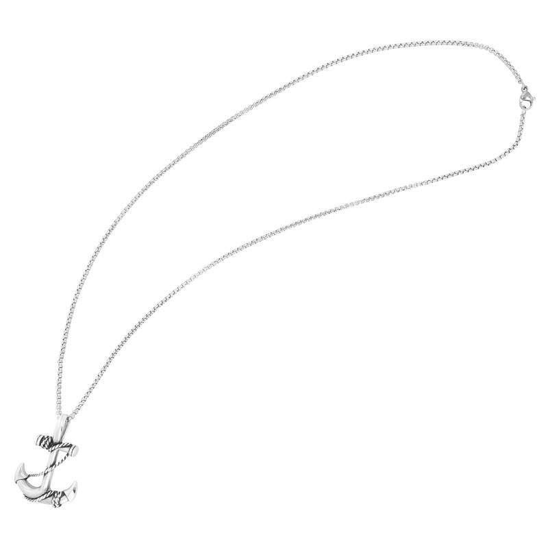 Größerer dreidimensionaler Anker Anhänger für Herren. Der massive Kettenanhänger besteht aus Edelstahl und ist teilweise geschwärzt. Der Anker trägt ein Seil, welches um den Anker gewickelt ist. Er wird zusammen mit einer 2 mm starken Rolokette geliefert, die etwa 55 cm lang ist. Sowohl die Kette, als auch der Edelstahlanhänger sind glänzend poliert.