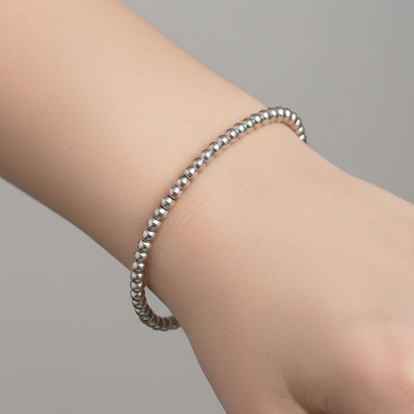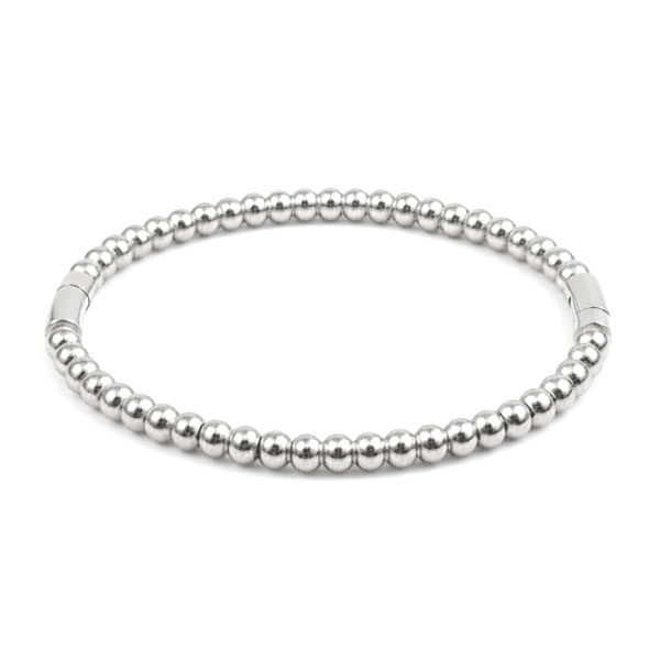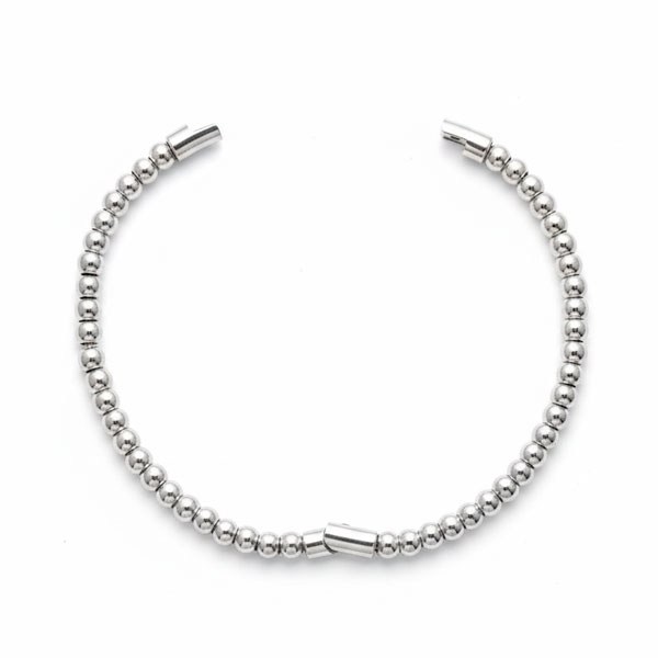 Schöne Armspange im modernen Kugel-Design hergestellt aus massivem Edelstahl. Der glänzende Kugel Armreif ist silberfarben und die Kugeln sind 4,5 mm breit. Das Schmuckstück hat ein Innenmaß von 60 x 50 mm, was etwa 19 cm in der Länge entspricht.