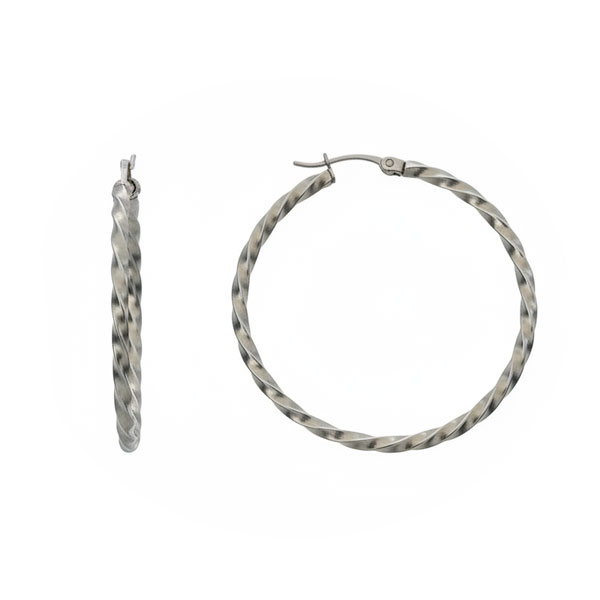 Große Edelstahl Creolen im gedrehten Design. Die Damen Ohrringe zeigen sich in einem dunklen silber Farbton. Ihre Oberfläche ist glänzend und diamantiert, so dass die Creolen leicht funkeln.