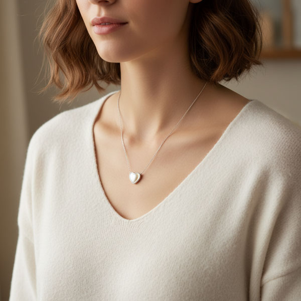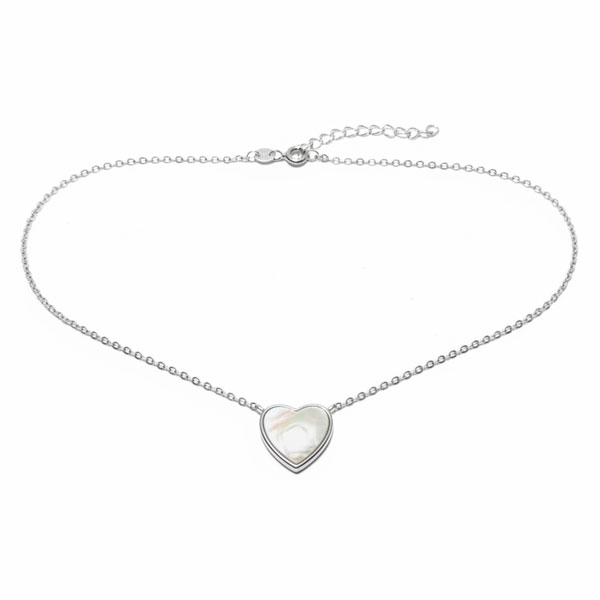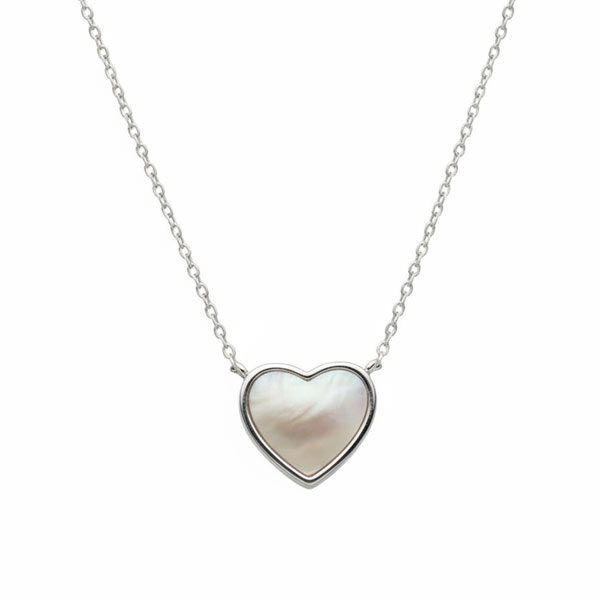 Traumhaftes Collier mit einem Herz mit einer Perlmutt-Einlage. Die Halskette für Damen ist aus 925 Silber hergestellt. Sie ist 42 cm lang und schmiegt sich schön an den Hals an. Dank Verlängerungskettchen kann sie stufenlos auf bis zu 45 cm verlängert werden.