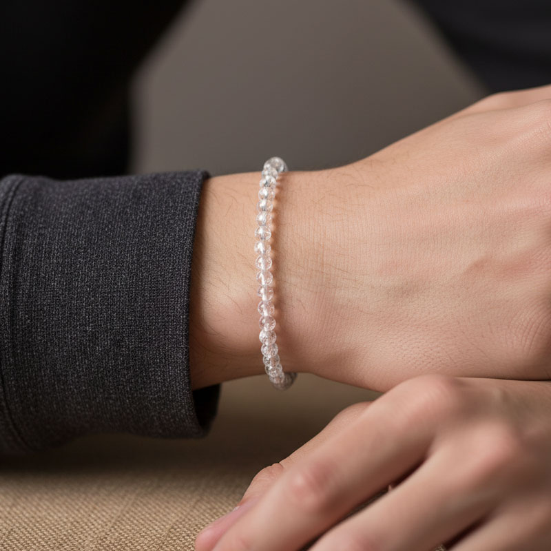 Die farblosen Edelsteine sind auf einem elastischen Gummiband aufgefädelt, so dass das Kugelarmband beim Anlegen auch dehnbar ist. Es ist dann ca. 20 cm lang und eignet sich so für Herren und Damen.