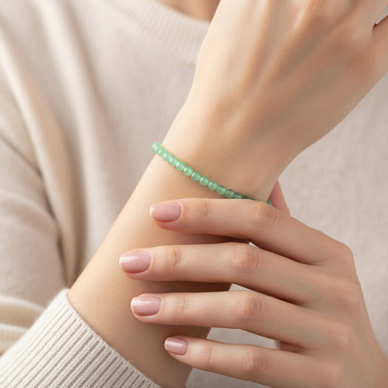 Traumhaftes grünes Kugel-Armband besetzt mit 3-4 mm kleinen Aventurin Kugeln. Die 46 glatt polierten Edelsteine sind auf einem elastischen Gummiband aufgefädelt, so dass das grüne Edelsteinarmband beim Anlegen auch dehnbar ist. Es ist dann ca. 19,5 cm lang.