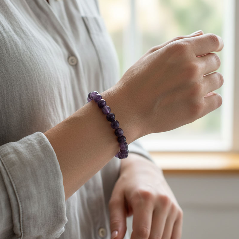 Das schöne Edelstein Kugelarmband zeigt sich in mittleren lila Farbtönen mit teilweise durchsichtigen Amethysten!
