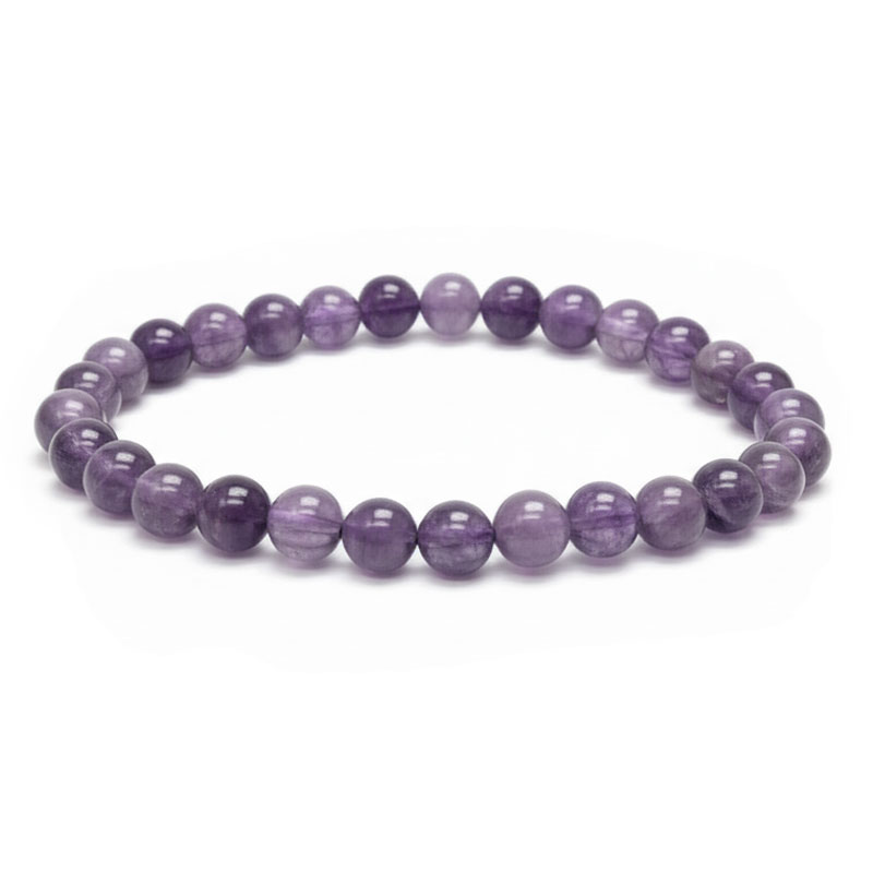 Zauberhaftes Kugel Armband für Damen besetzt mit 29 mittel lila Amethyst Kugeln. Die glatt polierten Amethyste sind etwa 6 mm groß und das Edelsteinarmband ist etwa 20 cm lang. Die Kugeln sind auf einem elastischen Gummiband aufgefädelt, so dass das Armband beim Anlegen auch dehnbar ist.