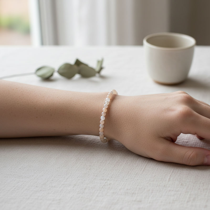 Die Edelstein Kugeln sind auf einem elastischen Gummiband aufgefädelt, so dass das Mondsteinschmuck Armband beim Anlegen dehnbar ist. Es ist umgerechnet ca. 19 cm lang.