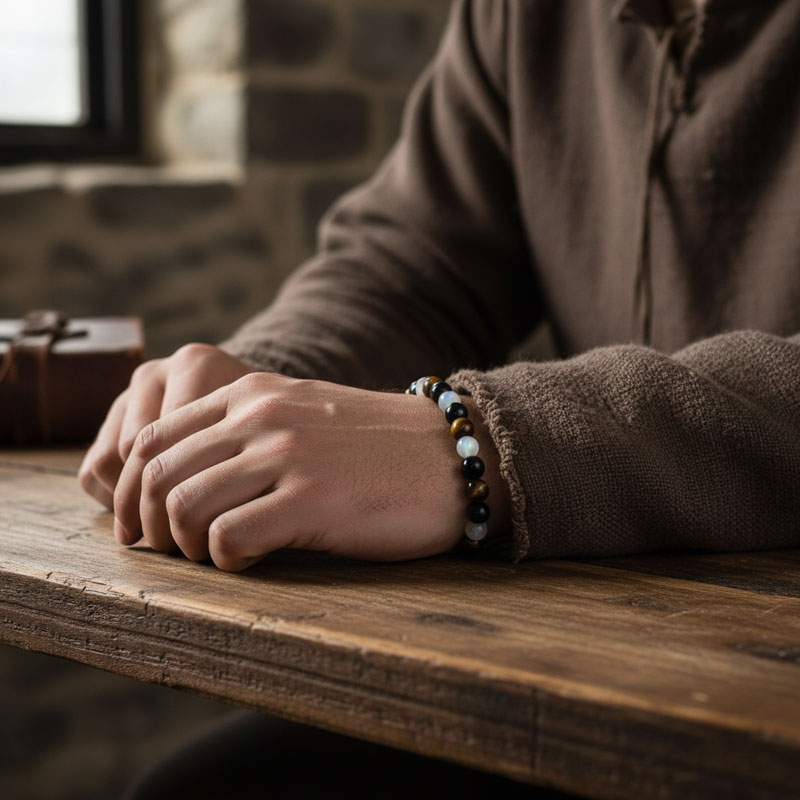Edles Herren Kugel-Mix-Armband besetzt mit 32 Edelstein Kugeln - schimmernder Labradorit, braunes Tigerauge und schwarzer Obsidian. Eine wirklich tolle Kombination aus 3 Edelsteinen!