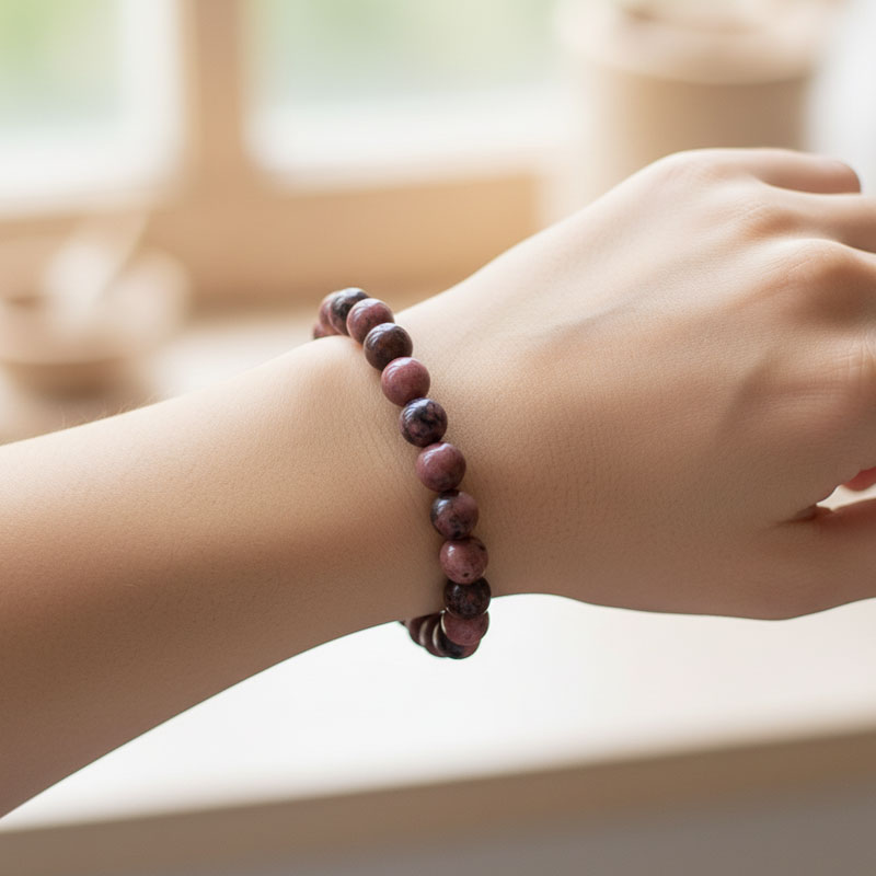 Die dunklen Rhodonit Kugeln sind auf einem elastischen Gummiband aufgefädelt, so dass das Kugel Armband beim Anlegen dehnbar ist. Es ist dann umgerechnet ca. 19,5 cm lang.