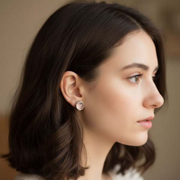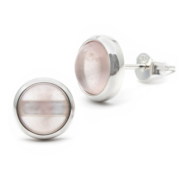 Große, runde Rosenquarz Ohrstecker aus 925 Silber. Die leicht gewölbten Edelsteine sind glatt geschliffen und glänzen schön. Sie sind rosa durchsichtig, so dass man die Silber-Halterung (Strebe) hindurchsehen kann.