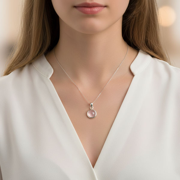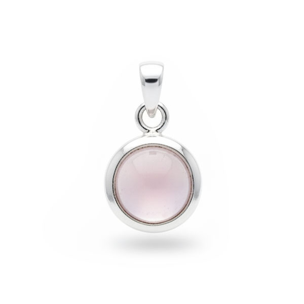 Zauberhafter Rosenquarz Anhänger mit rundem Edelstein gefasst in 925 Silber. Der Rosenquarz hat einen schönen rosa bis rosa-durchsichtigen Farbton. Die Rückseite des Anhängers ist offen, der Stein liegt aber nicht direkt auf der Haut.
