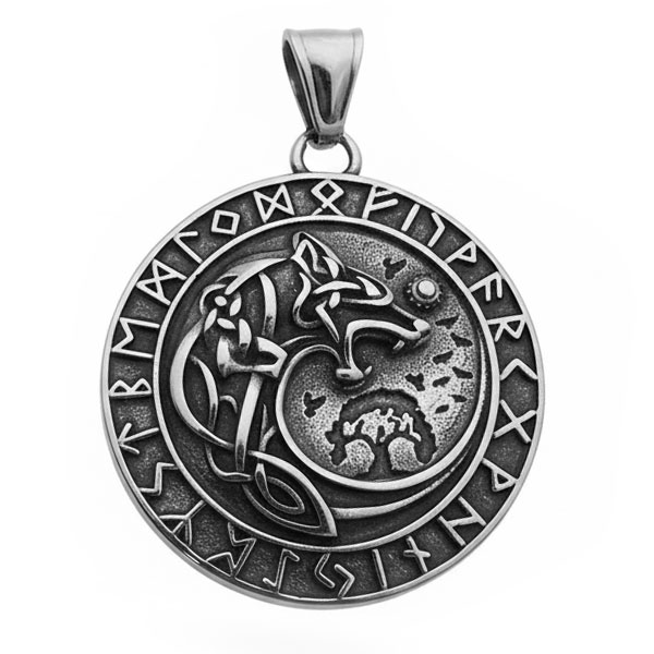 Anhänger Fenriswolf im Kreis mit Runen Edelstahl