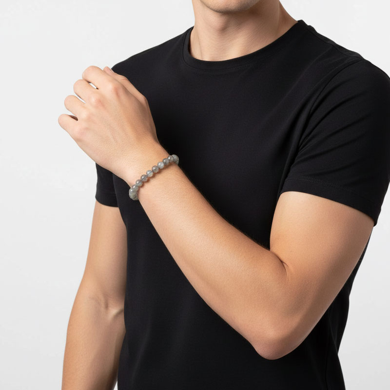 Die Labradorit Kugeln sind auf einem elastischen Gummiband aufgefädelt, so dass das Kugelarmband beim Anlegen dehnbar ist. Es ist dann etwa 19,5 cm lang und eignet sich für Damen und Herren.