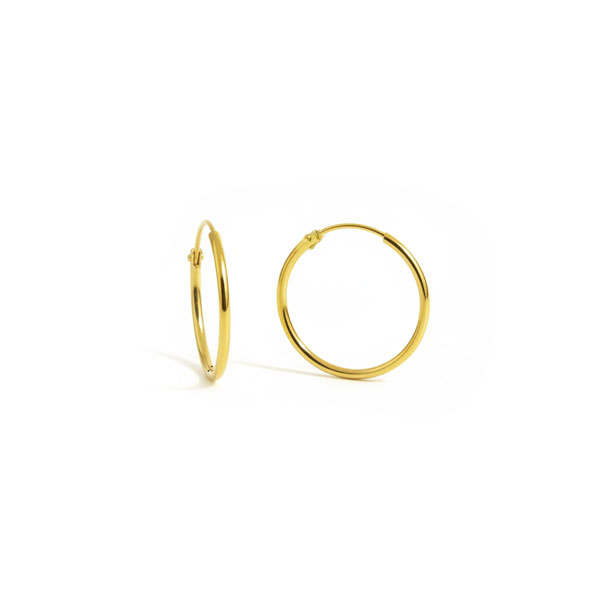 Runde Ohrringe aus vergoldetem 925 Silber. Die schmalen Creolen sind etwa 15 x 1,2 mm groß und glänzend poliert. Ihre goldene Farbe hat einen kräftigen Gelbton.