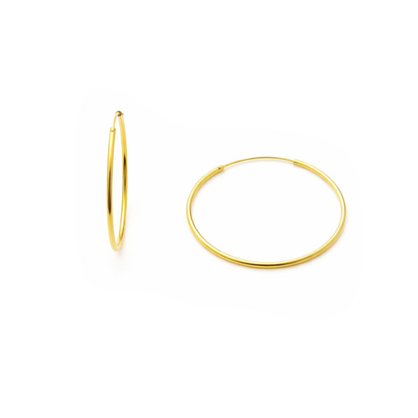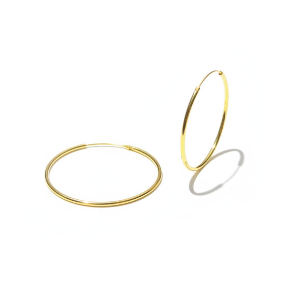 Runde Ohrringe aus vergoldetem 925 Silber. Die Damen Creolen sind etwa 30 x 1,5 mm groß und glänzend poliert. Ihre goldene Farbe hat einen kräftigen Gelbton.