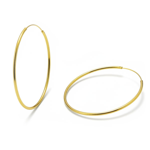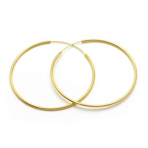 Runde Ohrringe aus vergoldetem 925 Silber. Die großen Creolen haben einen Durchmesser von 50 mm und sind etwa 1,5 mm stark. Ihre Oberfläche ist glänzend poliert. Ihre goldene Farbe hat einen kräftigen Gelbton.