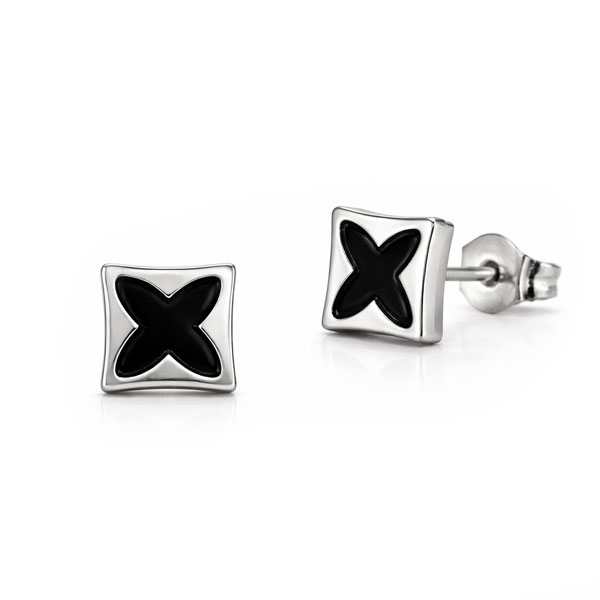 Edelstahl Ohrstecker Viereck mit schwarzer Klee Blume silberfarben