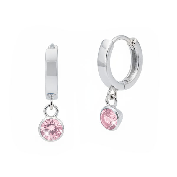 Traumhafte Kinder Creolen aus 925 Silber mit rosa Strass Anhängern. Die leichten Hänger Ohrringe werden auch Klapp-Creolen genannt. Dank ihrer Klapp-Mechanik können die Creolen einfach an Kinder-Ohren befestigt werden. Die runden Anhänger sind beweglich an den Ohrringen angebracht.