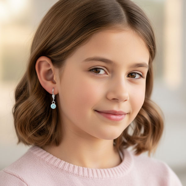 Wunderschöne Kinder Ohrringe mit aquamarin blauen Zirkonia Steinen gefasst in 925 Silber. Die runden Strass Kristalle sind facettiert geschliffen und funkeln ganz toll. Sie sind hinten kegelförmig eingefasst und als Ohrhänger an einer stabilen Klapp-Brisur befestigt. Die Brisur lässt sich leicht öffnen / schließen und ist daher gut für Kinderhände geeignet.