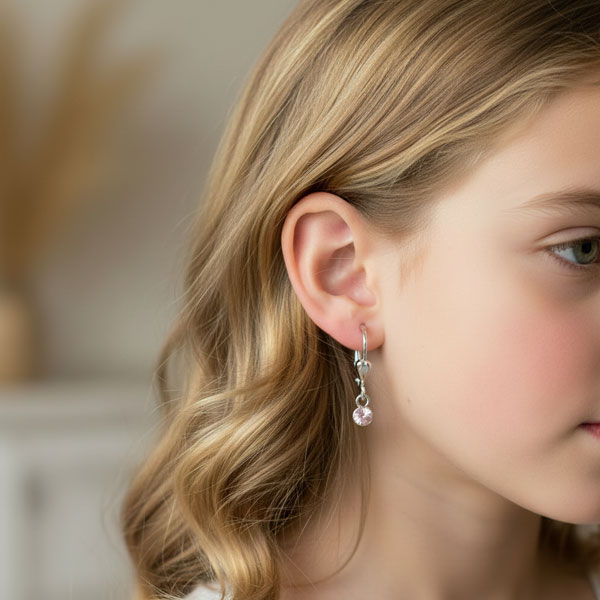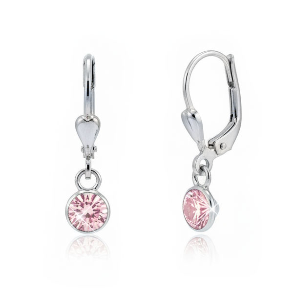 Traumhafte Kinder Ohrringe mit runden Zirkonia Steinen gefasst in 925 Silber. Die rosa Strass Kristalle sind facettiert geschliffen worden und funkeln wunderschön. Sie sind hinten kegelförmig eingefasst und als Ohrhänger an einer stabilen Klapp-Brisur befestigt. Die Brisur lässt sich leicht öffnen / schließen und ist daher gut für Kinderhände geeignet.