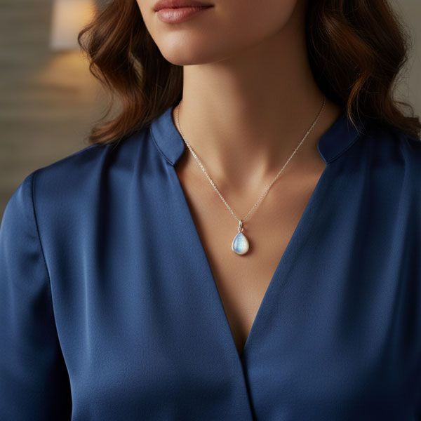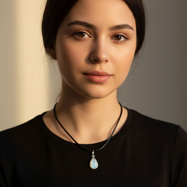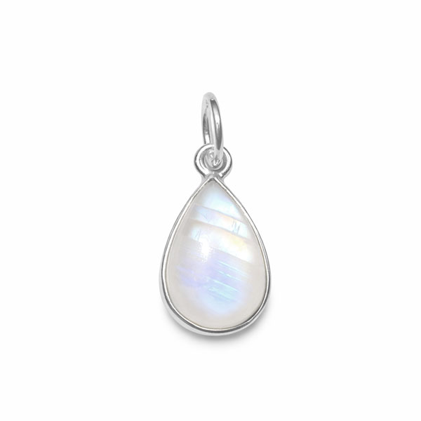 Der Regenbogen Mondstein ist auch als weißer Labradorit bekannt. Als Mondstein Tropfen Anhänger mit Ring-Öse eignet sich der Schmuck für Damen und größere Mädchen.
