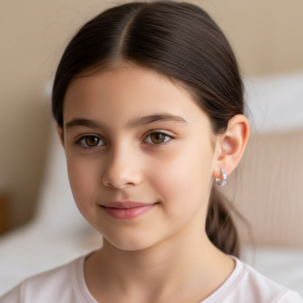 Die kleinen Steine der Kinder Creolen zeigen sich in hellen Farbtönen wie hell rosa, flieder lila und einem hellen blau. Die insgesamt 14 Strass Steine sind facettiert geschliffen und funkeln.