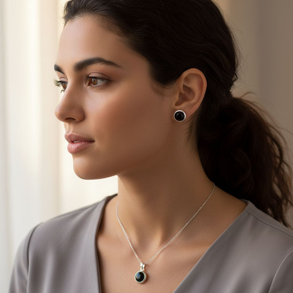 Edle Onyx Ohrstecker mit runden Edelsteinen gefasst in 925 Silber. Die gewölbten schwarzen Steine sind glatt geschliffen und glänzen wunderschön. Die Onyx Ohrringe sind massiv verarbeitet und das Silber ist ebenfalls glänzend poliert.