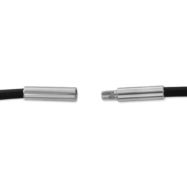 Schwarze Kautschukkette mit mattiertem Edelstahl Bajonett-Verschluss, der durch Klicken / Drehen geöffnet bzw. geschlossen wird. Das 2,5 mm breite Kautschukband eignet sich sehr gut für Anhänger aus Silber, Edelstahl, Metall sowie für Edelsteine und Perlen.