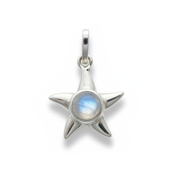 Maritimer Schmuck mit Seestern aus 925 Silber. Der leichte Seestern Anhänger ist mit einem runden Mondstein besetzt. Er ist weißlich bis durchsichtig und schimmert blau oder regenbogenfarbend (je nach Bestand). Seine Oberfläche ist glatt geschliffen mit einem so genannten Cabochon-Schliff. Der Mondstein ist auch als weißer Labradorit bekannt.